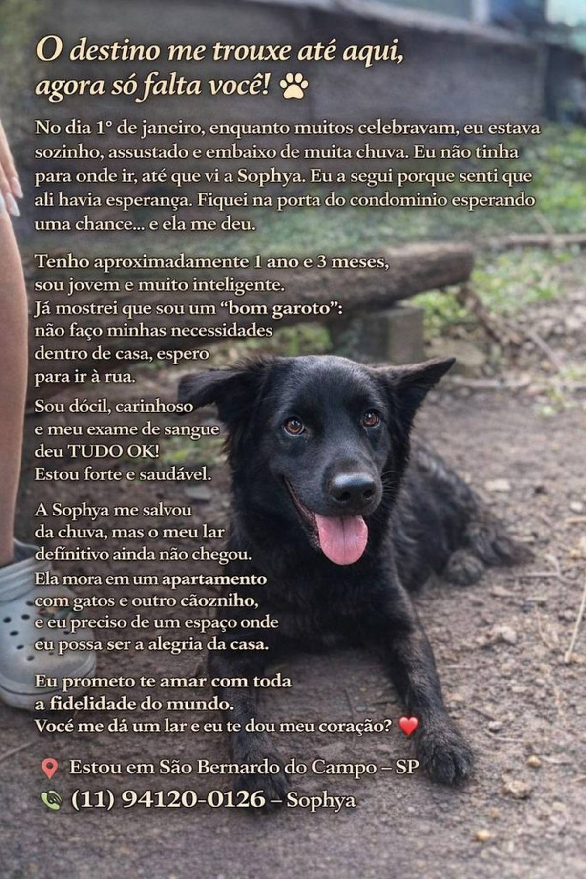 Infelizmente, não posso adotá-lo, mas estou fazendo de tudo para que ele encontre um lar cheio de amor e cuidado, como ele merece.