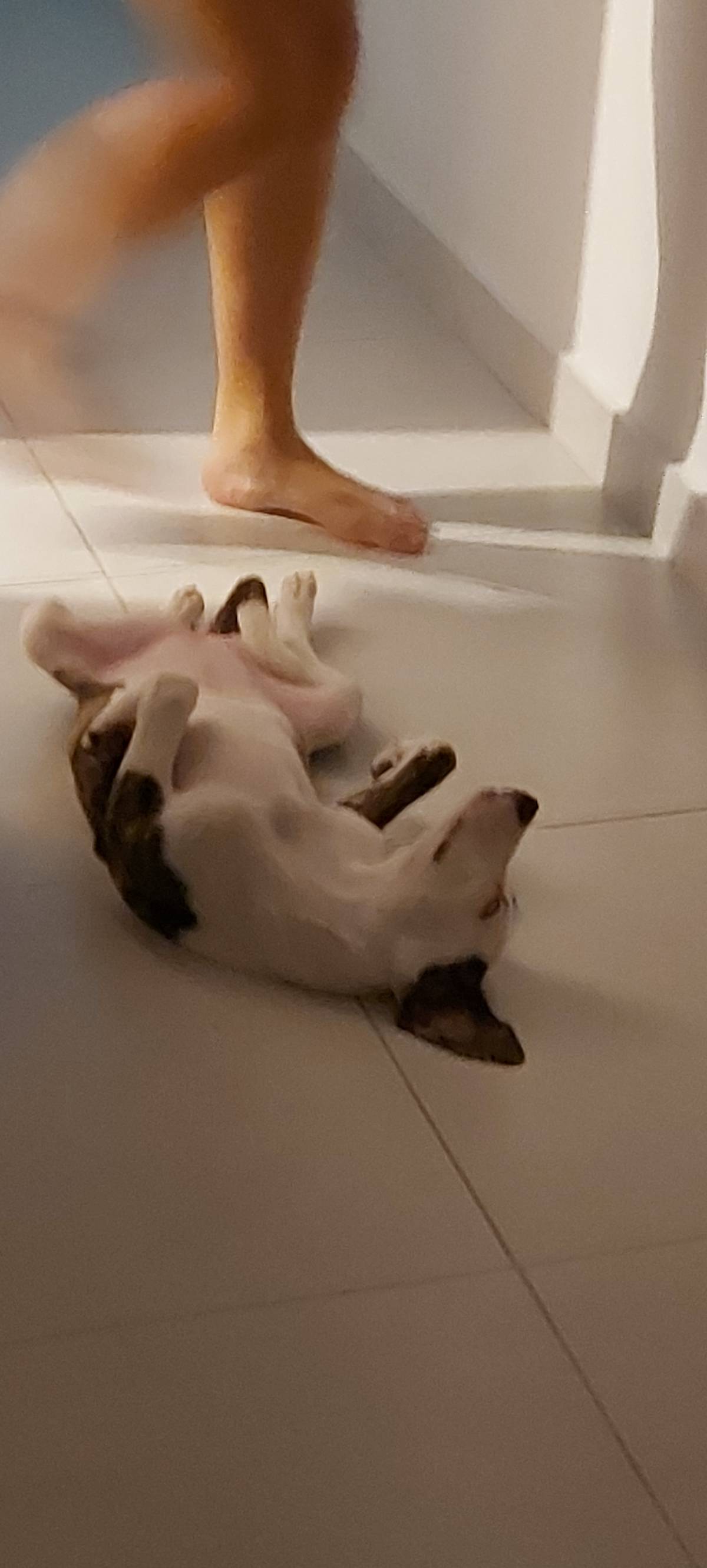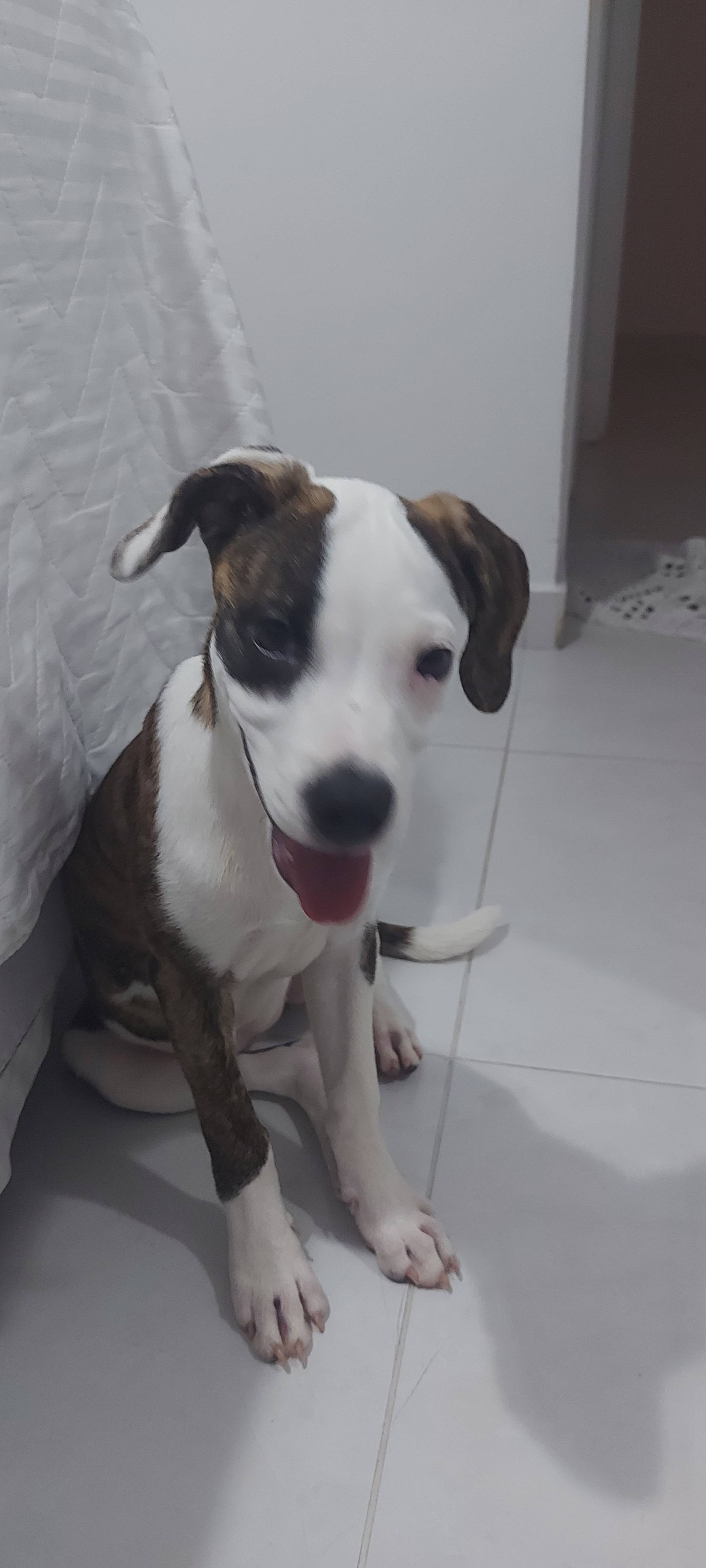 Já faz as necessidades no tapetinho. Ela é mistura de american pitbull terrier.