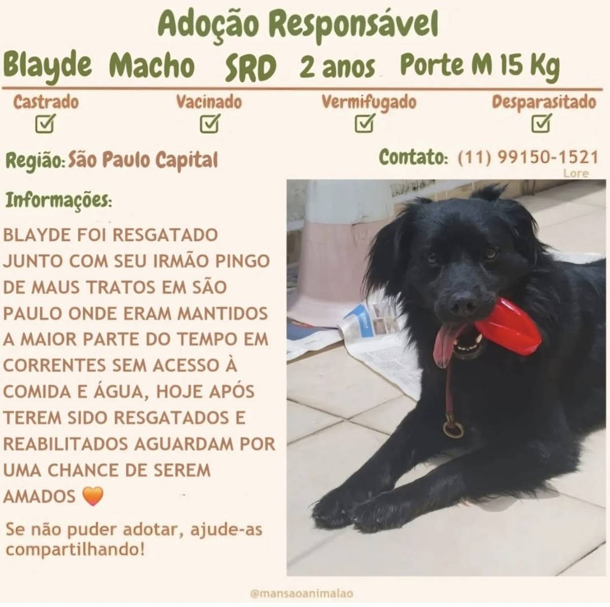 Quer adotar ou quer ver mais fotos, vídeos e saber mais informações sobre ele? Chame no WhatsApp: