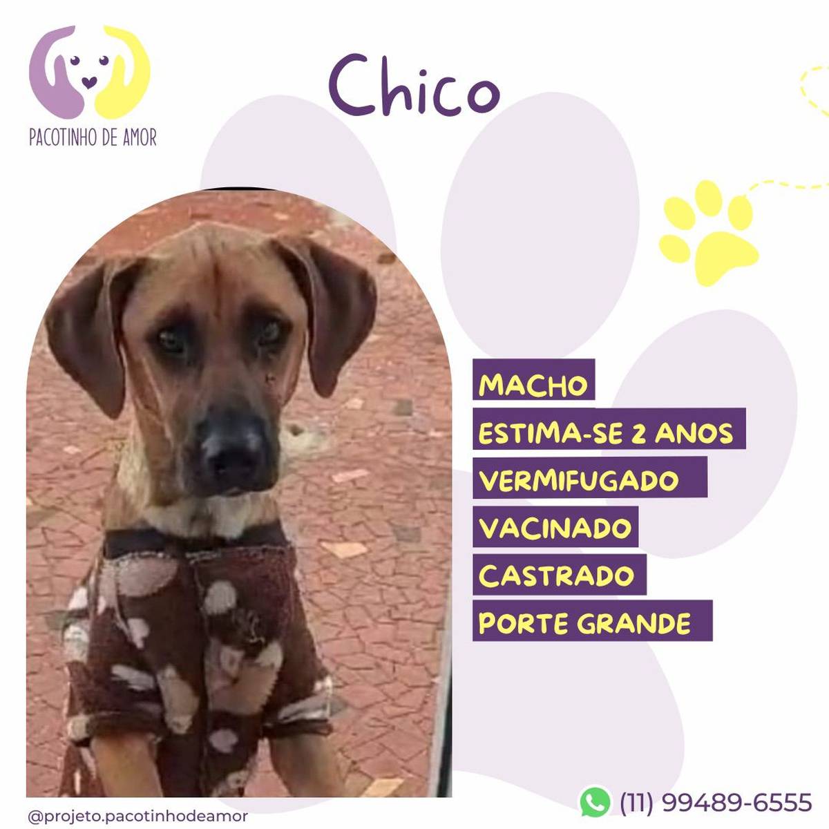 Obs.: Não reservamos animais. Não fazemos adoção por terceiros. Enviamos resposta para os perfis aprovados em até 2 dias úteis.