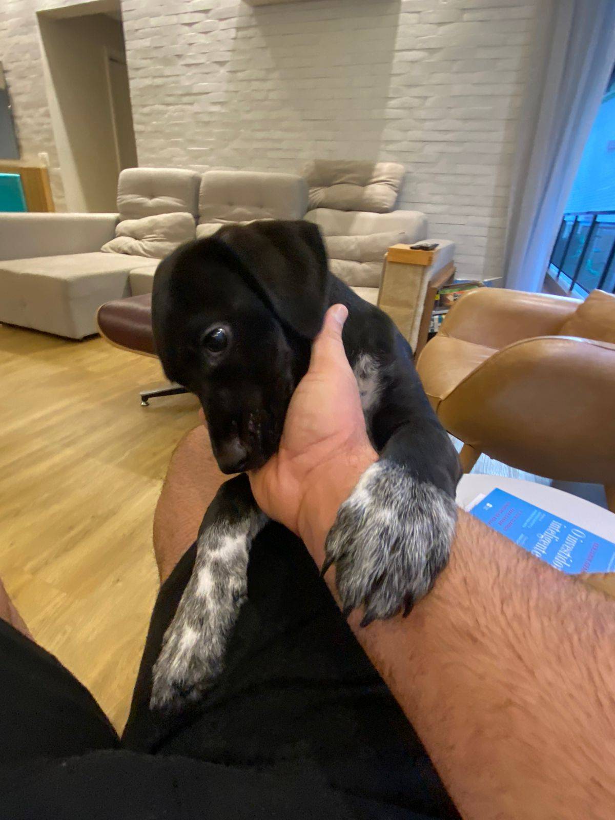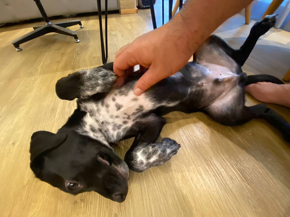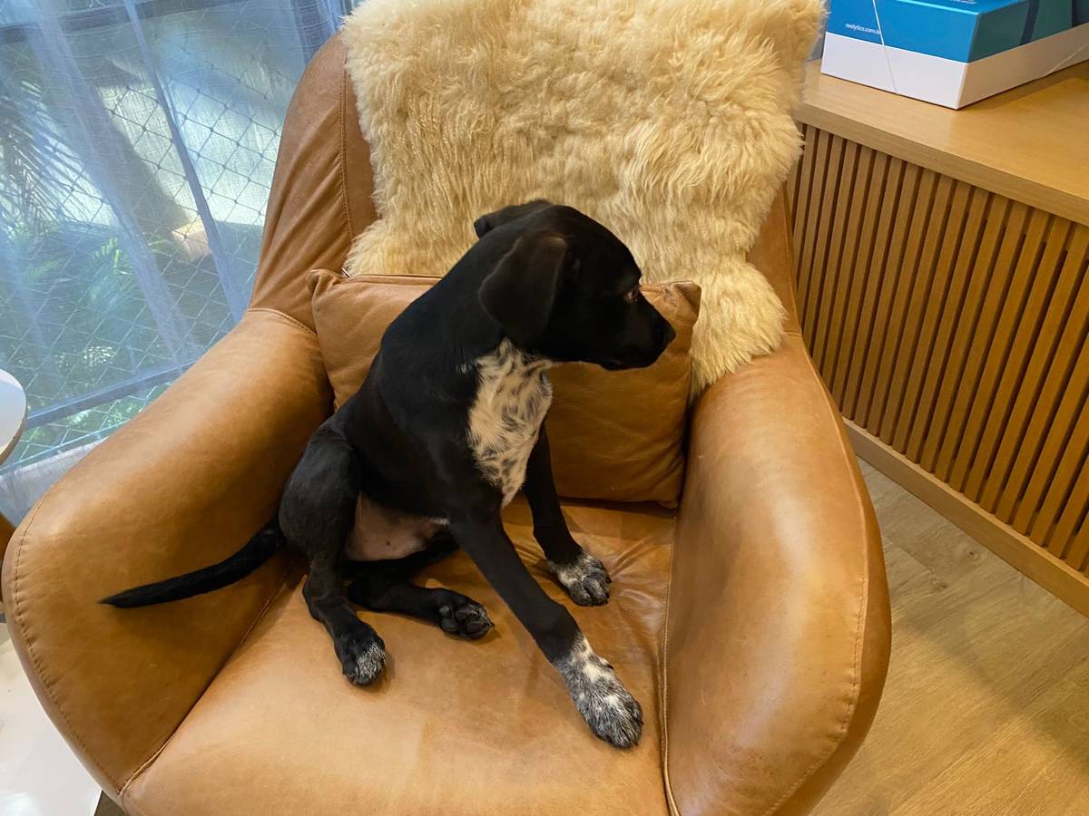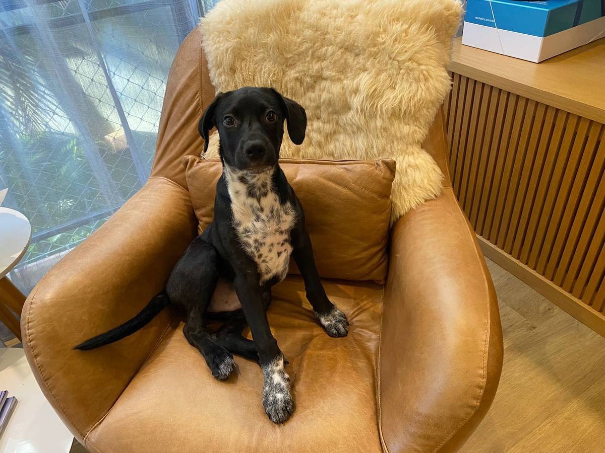 A idade é estimada é de 4 meses e também estima-se que tenha em sua linhagem genes de Pointer, Dálmata e Border Collie. Estima-se, ainda, que será um cachorro de médio porte e magro e musculoso.