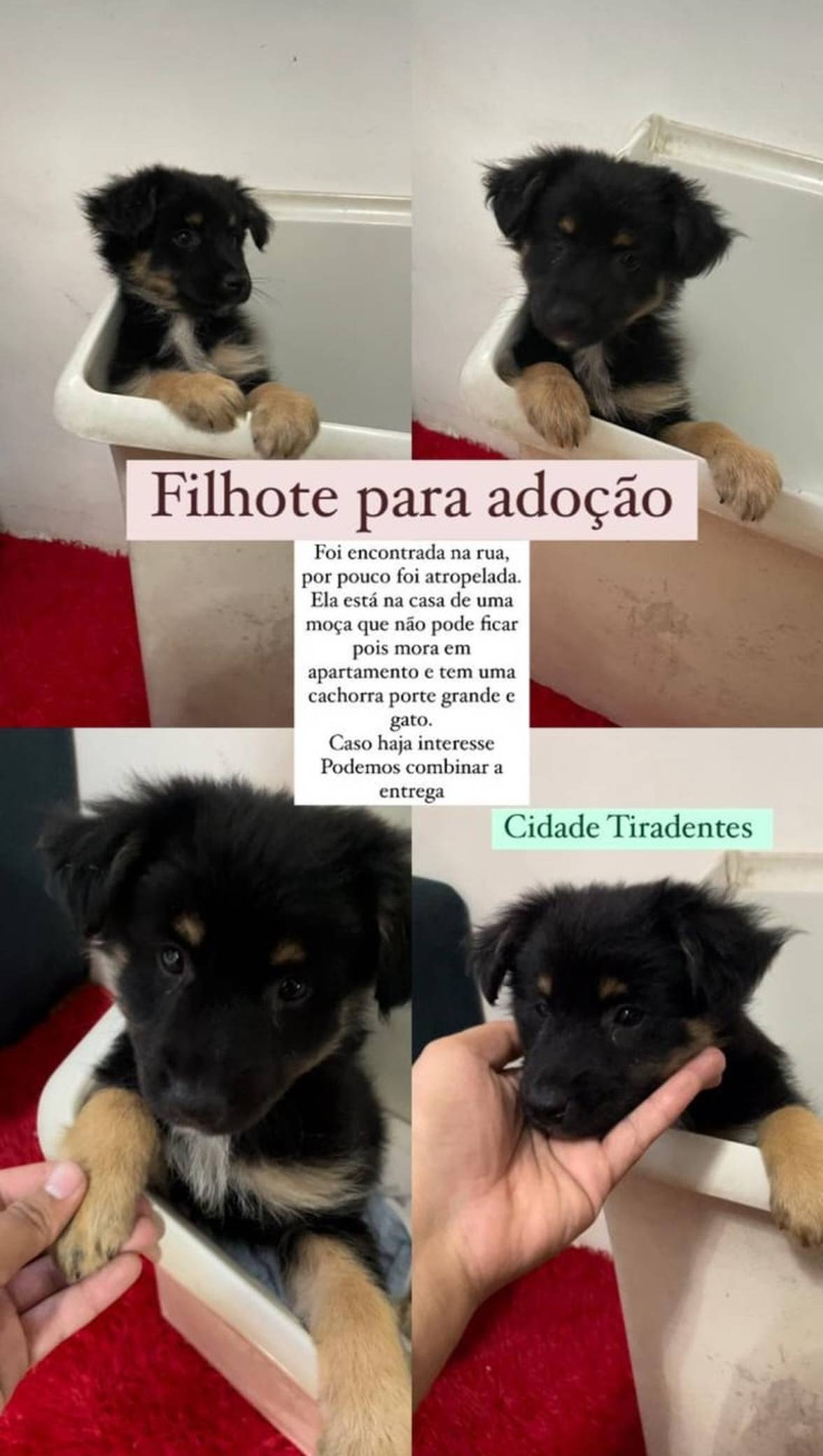 Ela está na Cidade Tiradentes, zona leste de SP, na casa de uma mulher que já tem animais e não pode ficar. Quem tiver interesse, podemos negociar a entrega.