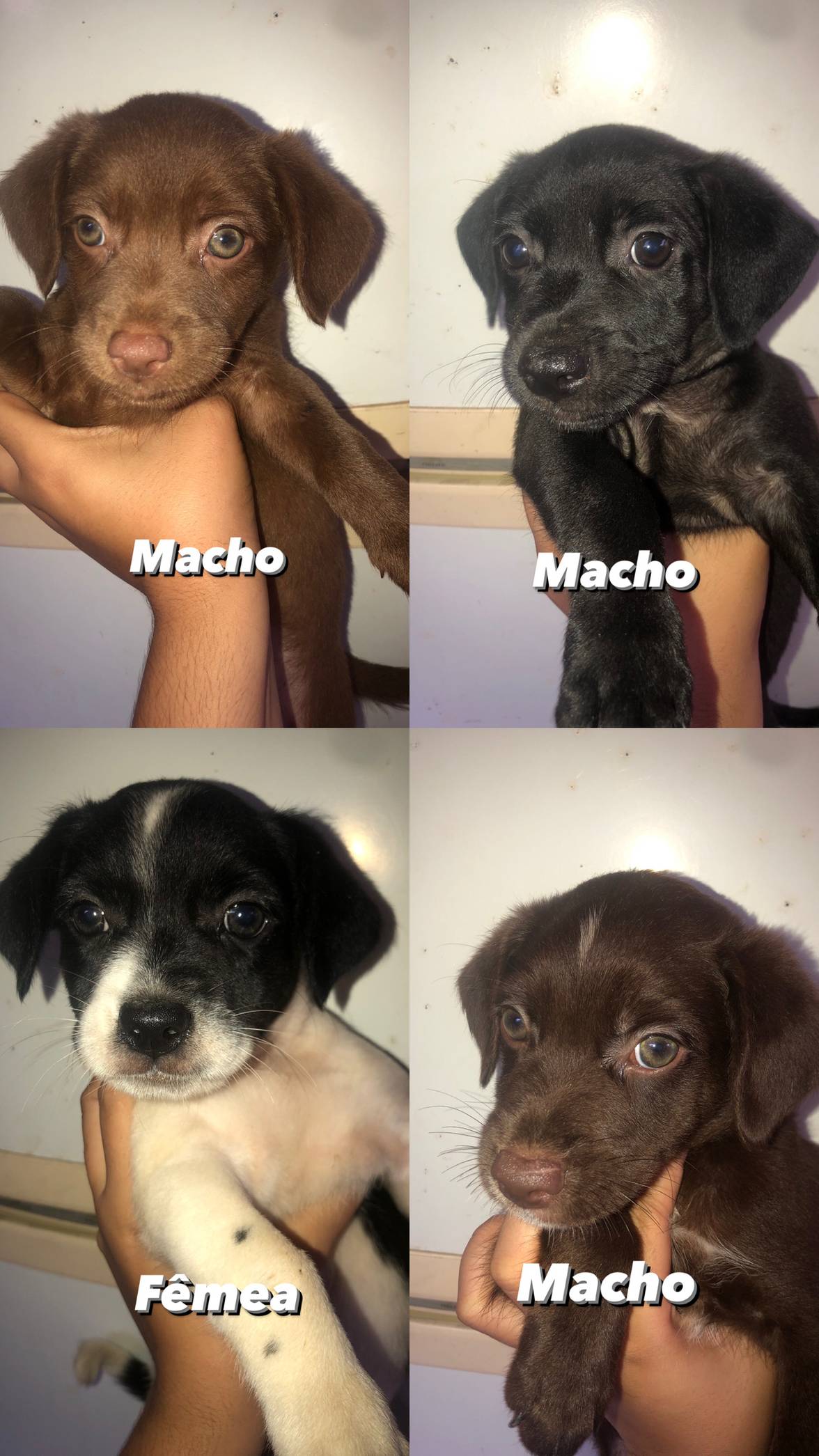 Dois machos puxaram para porte pequeno (marrom claro e preto) e 2 puxaram para porte médio. (Branco com preto e marrom escuro)