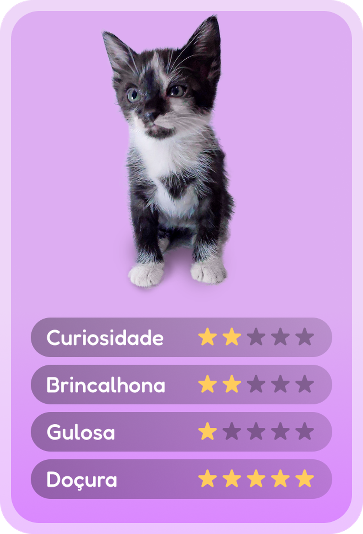 Ela é muito sociável e se dá bem com outros gatos, crianças, idosos e até desconhecidos. É uma gatinha independente, que pode viver tranquilamente em uma casa com quintal ou apartamento. Ela vai trazer muita alegria e diversão para sua vida!