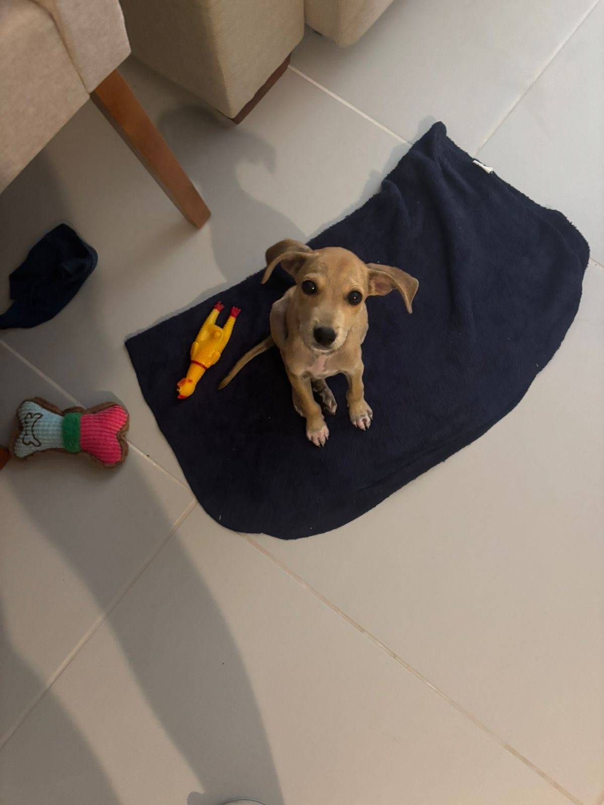 Filhotinho resgatado, muito dócil, carinhoso e tranquilo. Não é de latir e se adapta bem ao convívio com pessoas.