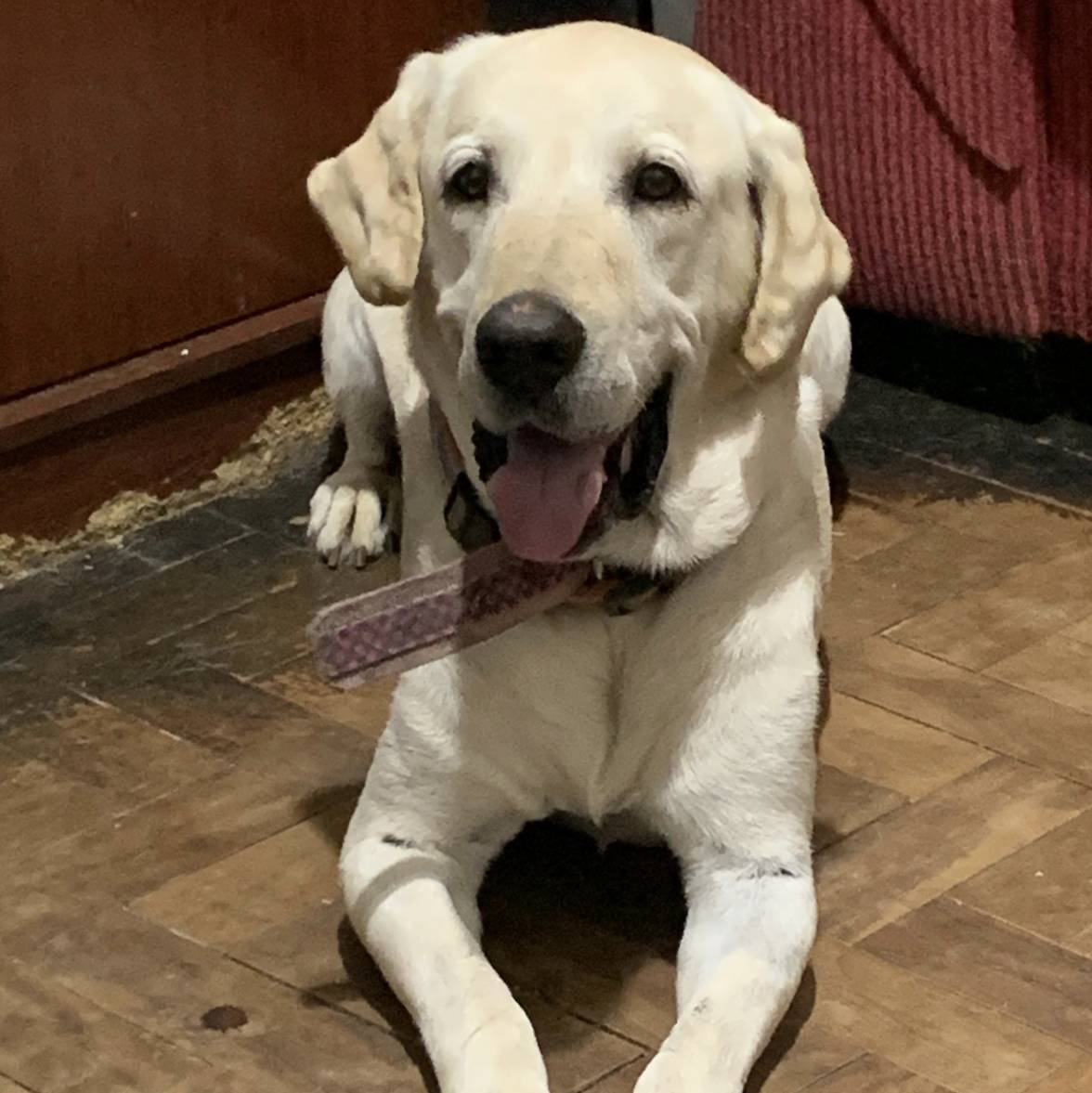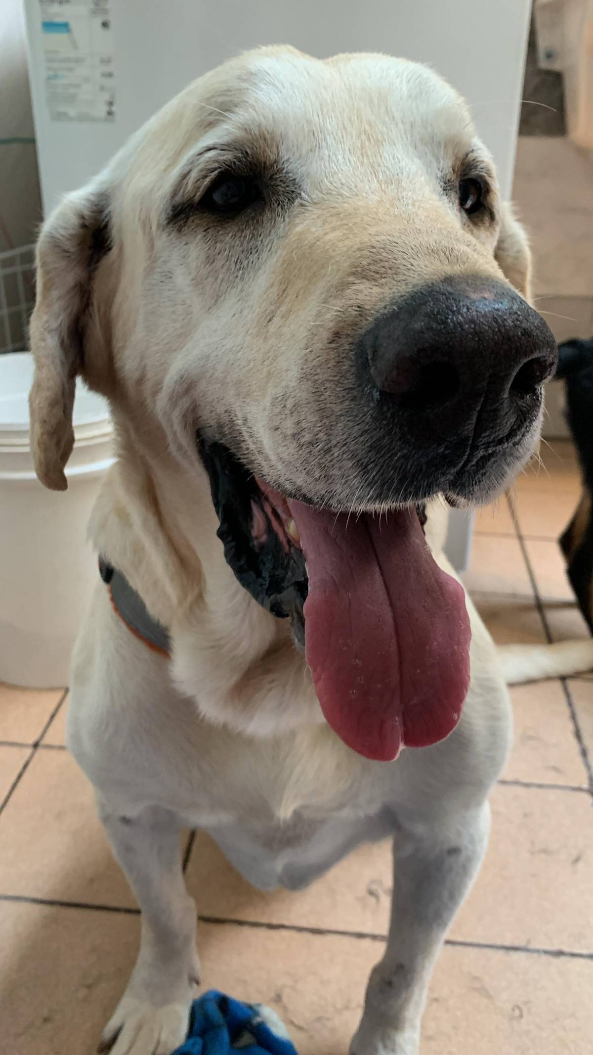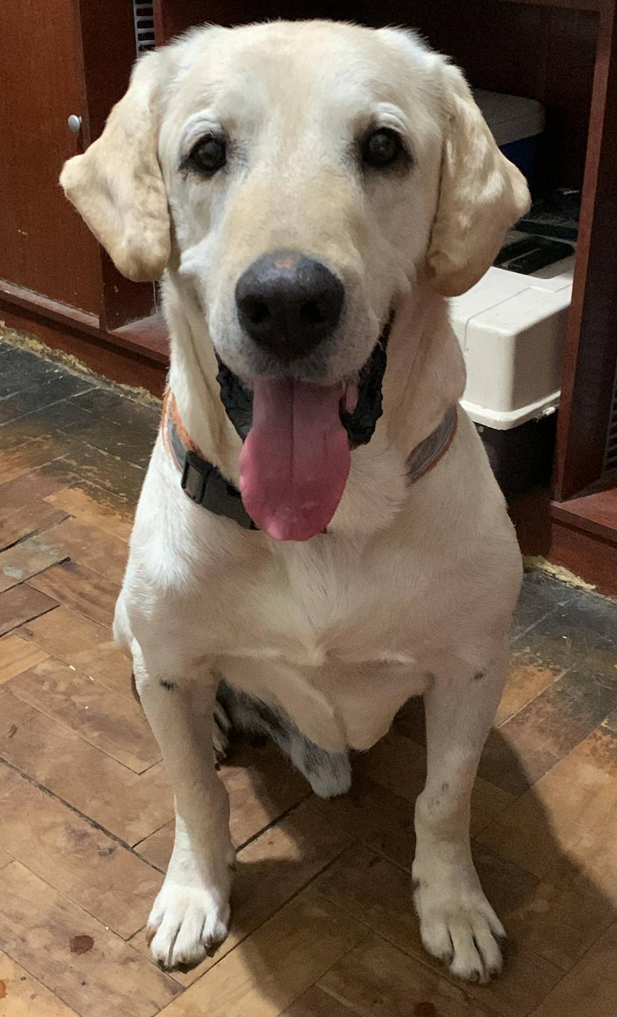 Porte grande, raça labrador, peso 35kg e tem 12 anos