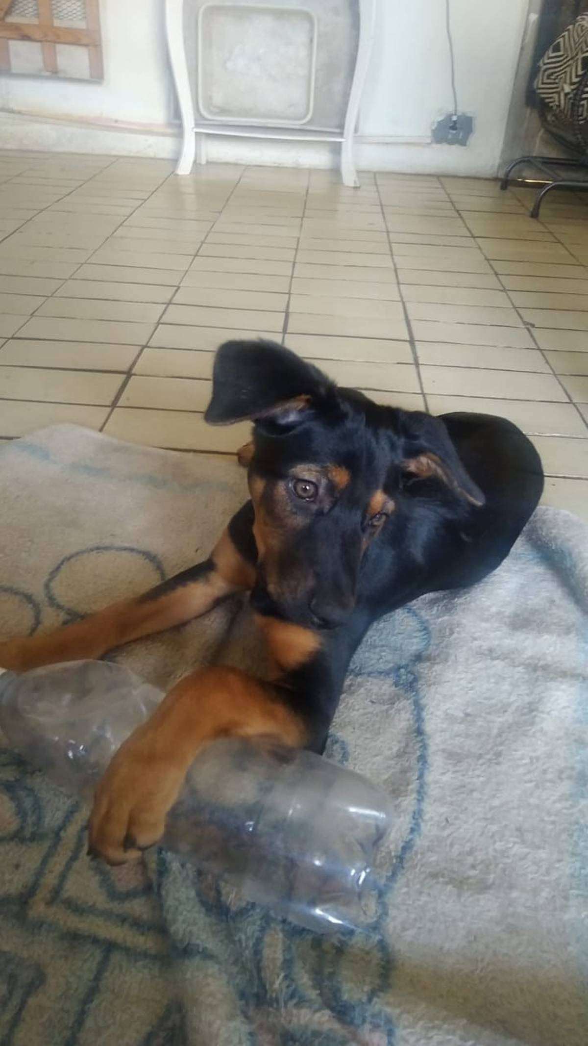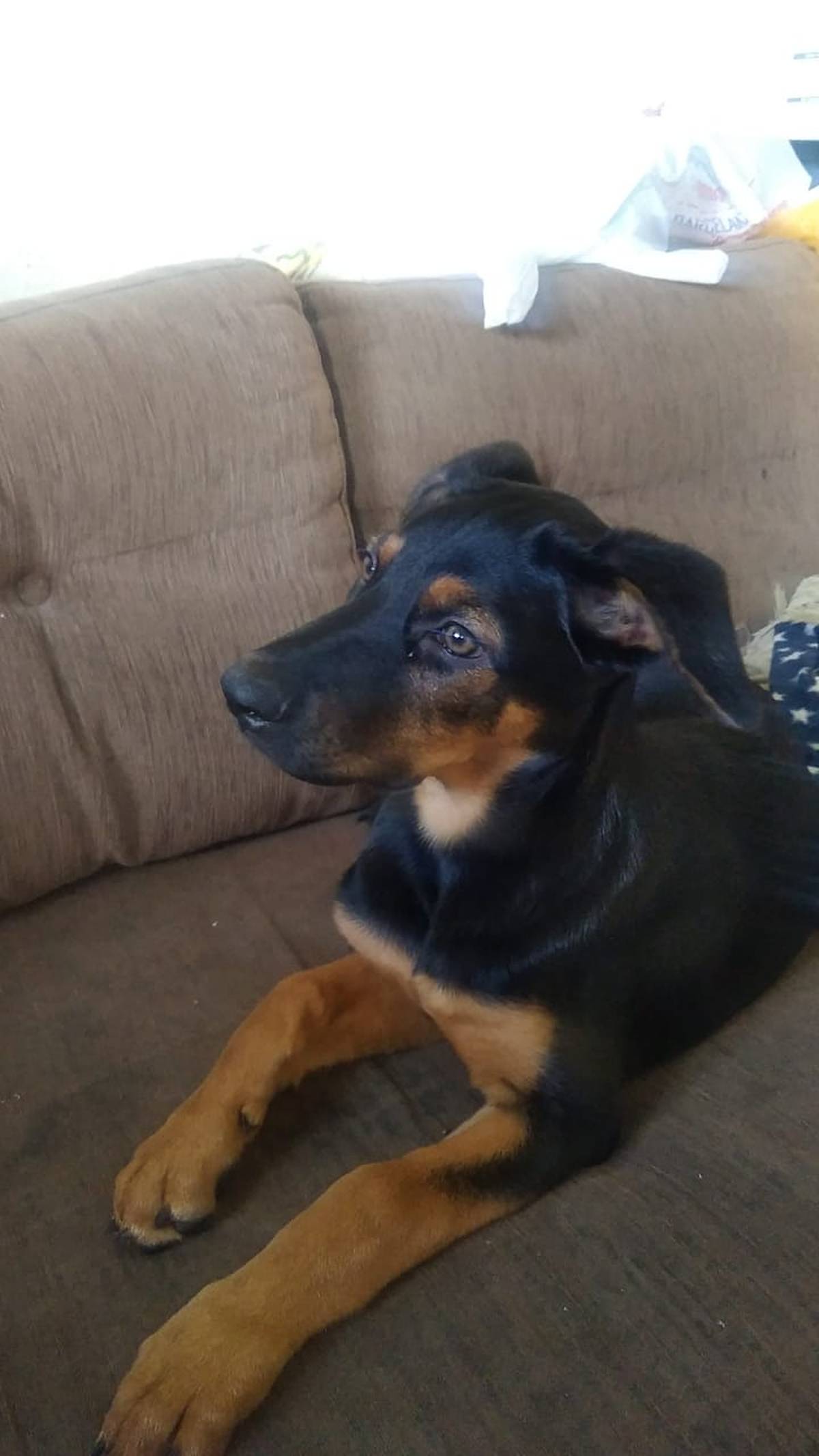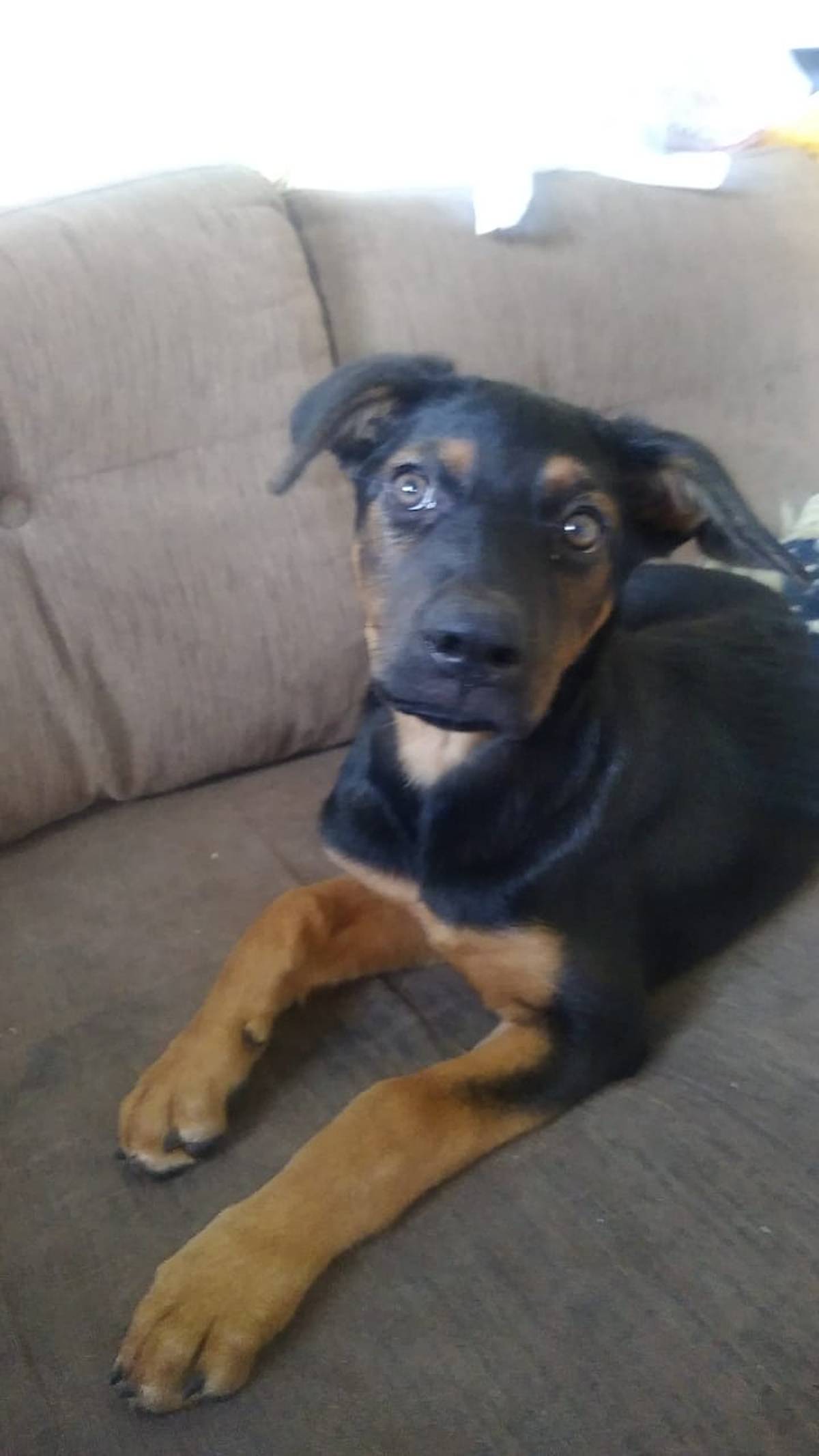 Há cerca de um mês, uma cadelinha foi abandonada no meu quintal durante a madrugada. Ela tem aproximadamente 2 a 3 meses, é muito carinhosa, brincalhona e cheia de energia, parecendo ser de porte médio a grande quando adulta.