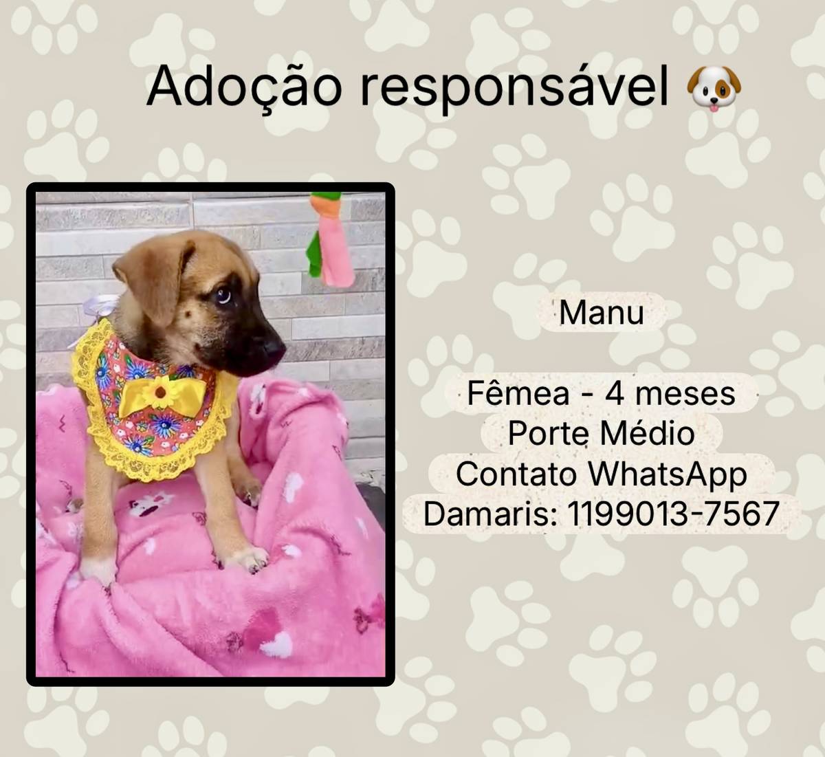 Animais têm sentimentos e precisam de cuidados e atenção todos os dias. Ao adotar, você será responsável por garantir que ele seja cuidado e amado durante toda a vida dele!