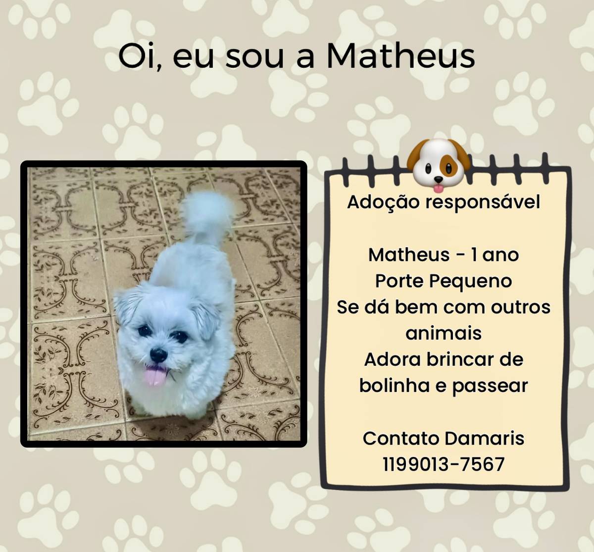 Animais têm sentimentos e precisam de cuidados e atenção todos os dias. Ao adotar, você será responsável por garantir que ele seja cuidado e amado durante toda a vida dele!