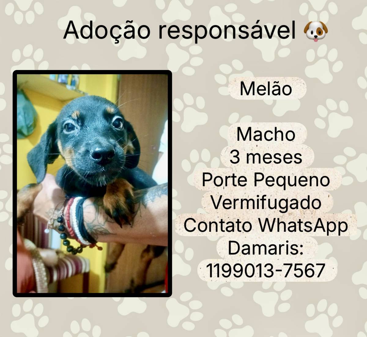 Animais têm sentimentos e precisam de cuidados e atenção todos os dias. Ao adotar, você será responsável por garantir que ele seja cuidado e amado durante toda a vida dele!