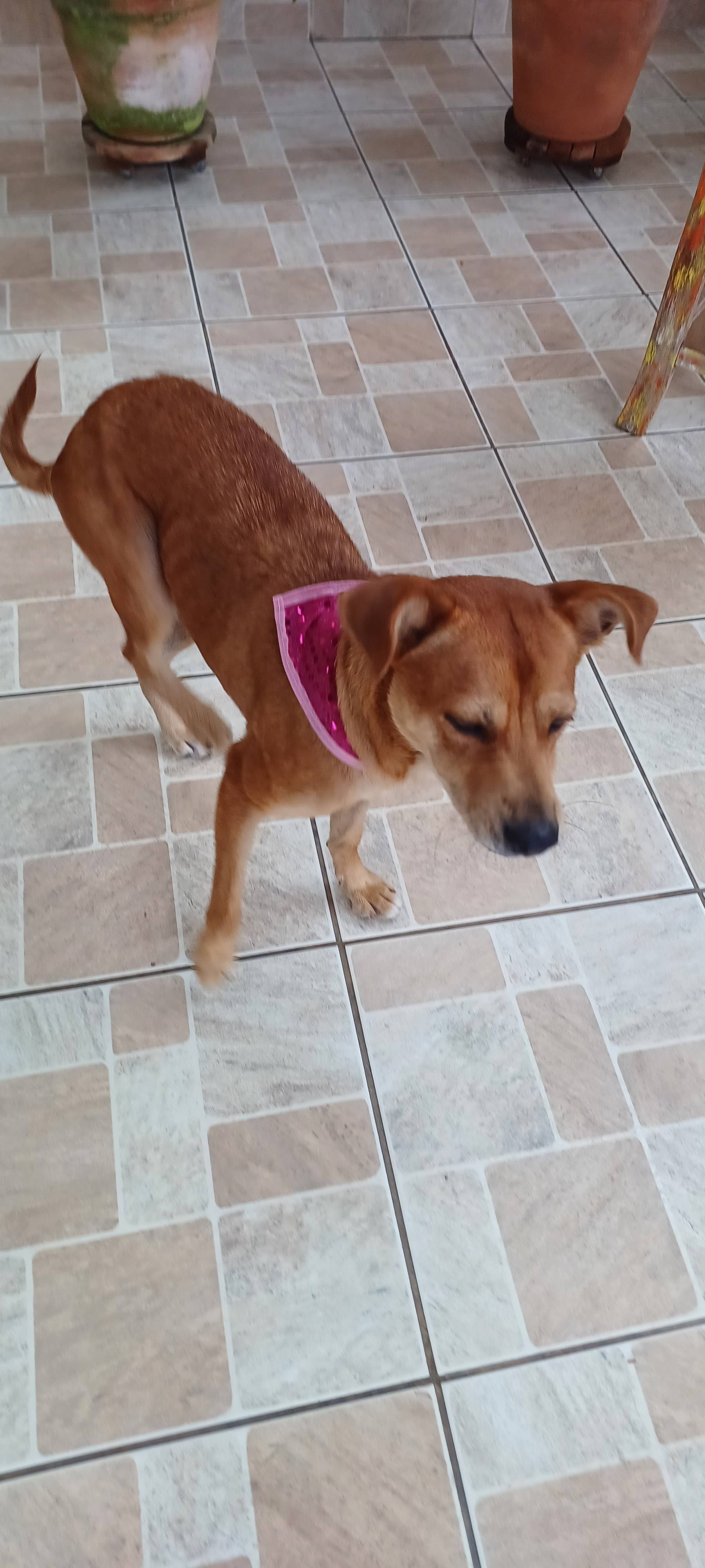 Ela tem a cor caramelo, pelo curto, novinha, deve ter de 1 à 1 ano e meio de idade.