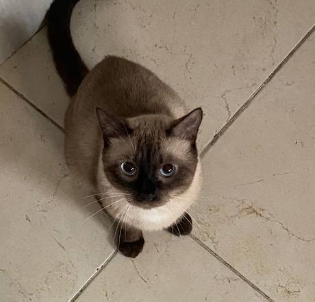 Mia tem aproximadamente 3 meses, come ração seca e faz às necessidades na caixinha de areia.