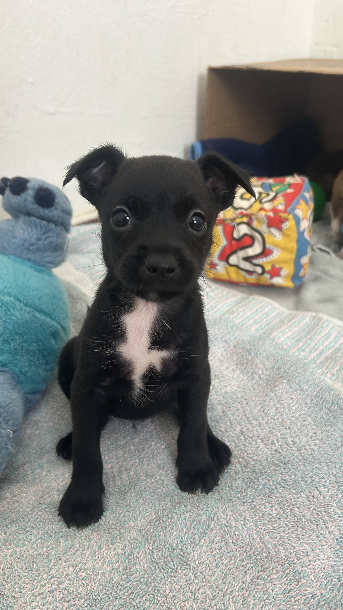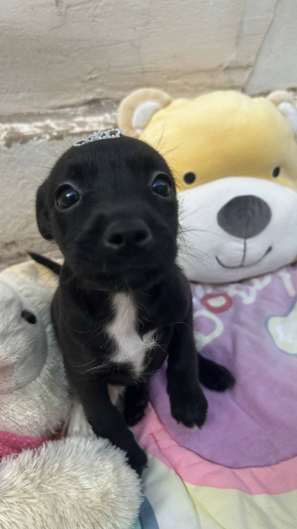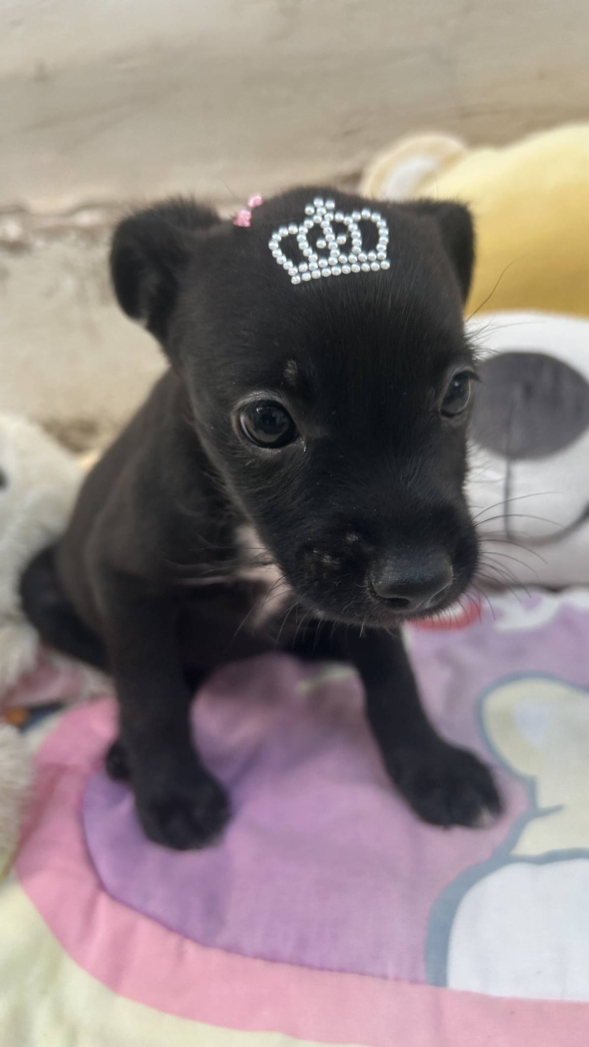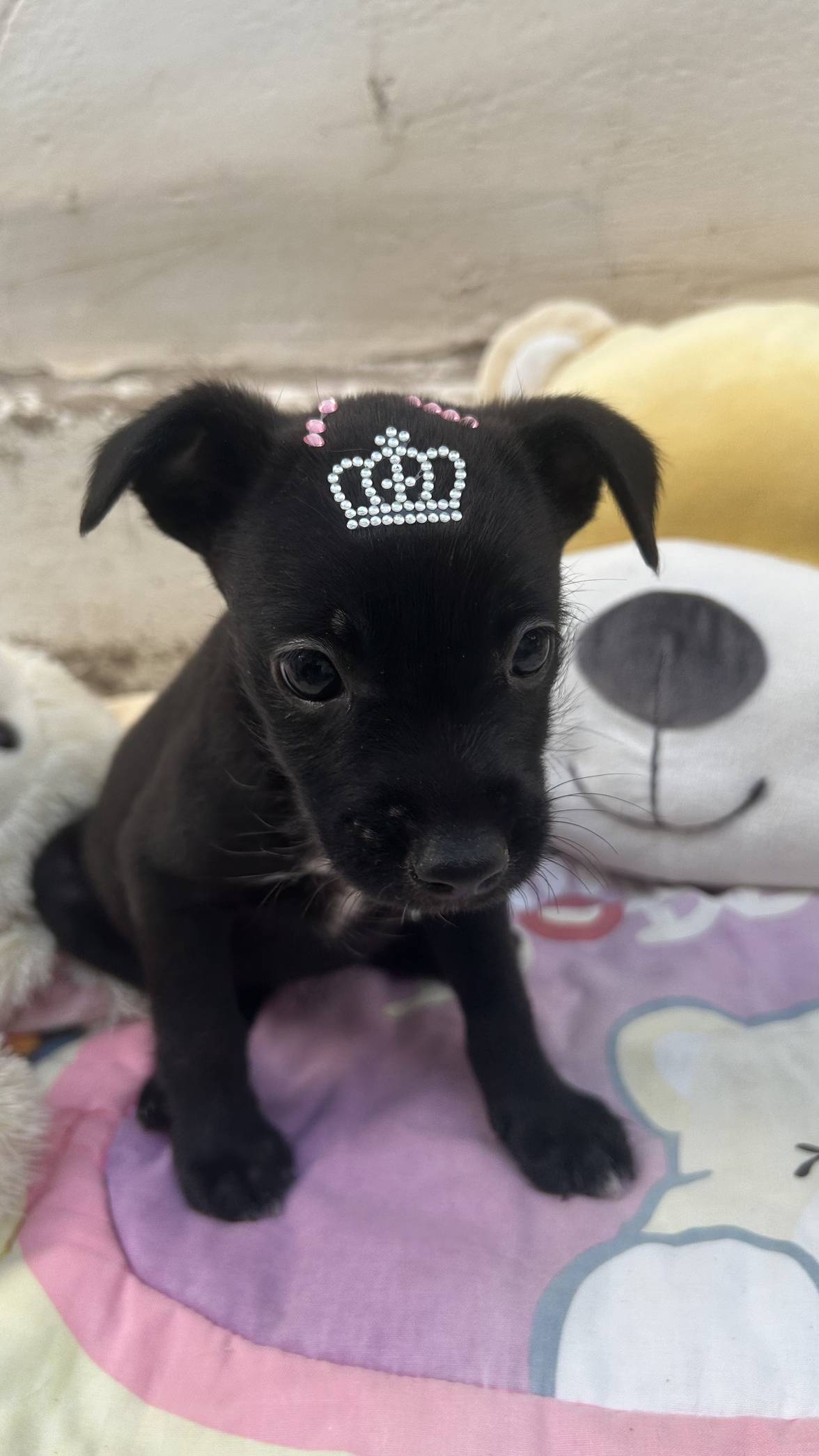 Estão com aprox 50 dias. O porte de filhote é sempre surpresa, no caso deles, estimamos que serão de porte pequeno a pequeno médio (10-15kg). Estão pesando em torno de 1kg. São dois machinhos e uma fêmea (a pretinha) 🤍
