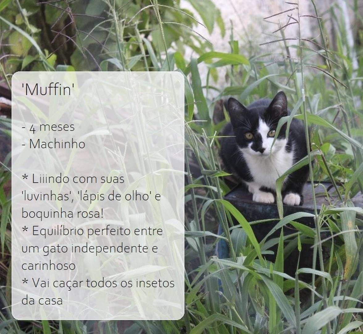 Com quase 5 meses, Muffin é carinhoso e independente na medida certa. Ele é filho de uma gata do mato e se não o resgatássemos, ele estaria vivendo por aí correndo risco de ser pego por cães, cobras ou pessoas maldosas. Infelizmente já temos gatos demais e o meu adulto não se deu bem com ele.