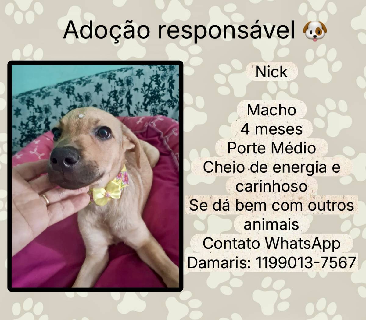 Animais têm sentimentos e precisam de cuidados e atenção todos os dias. Ao adotar, você será responsável por garantir que ele seja cuidado e amado durante toda a vida dele!