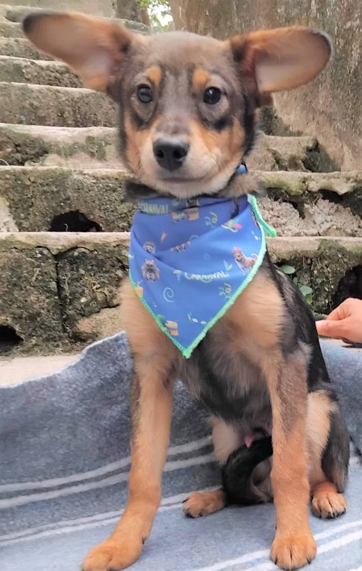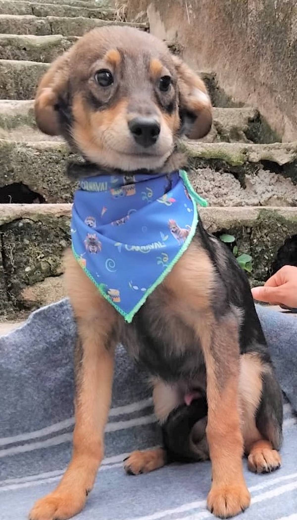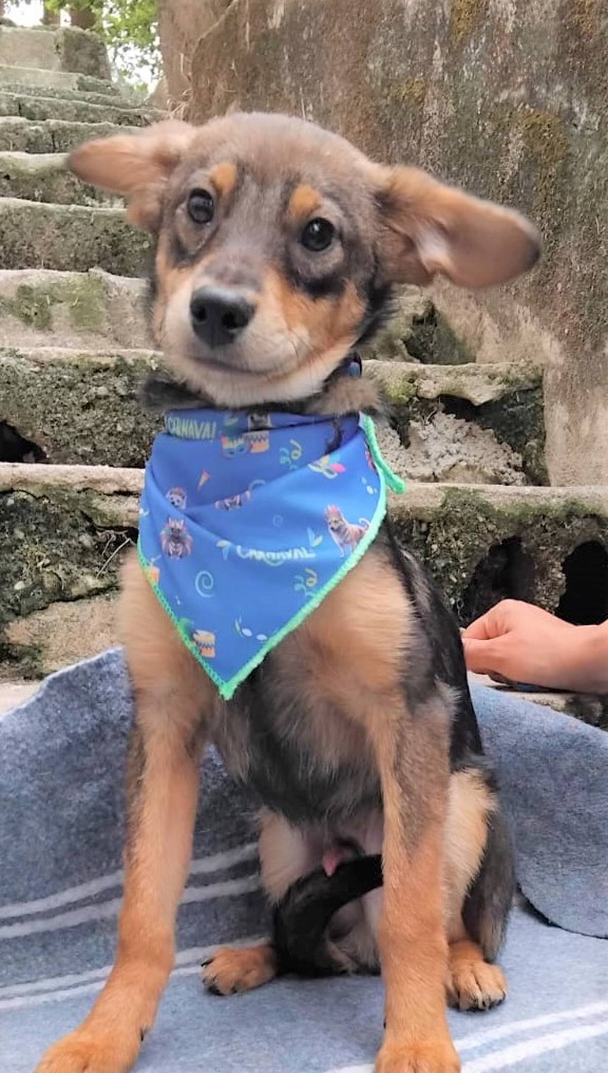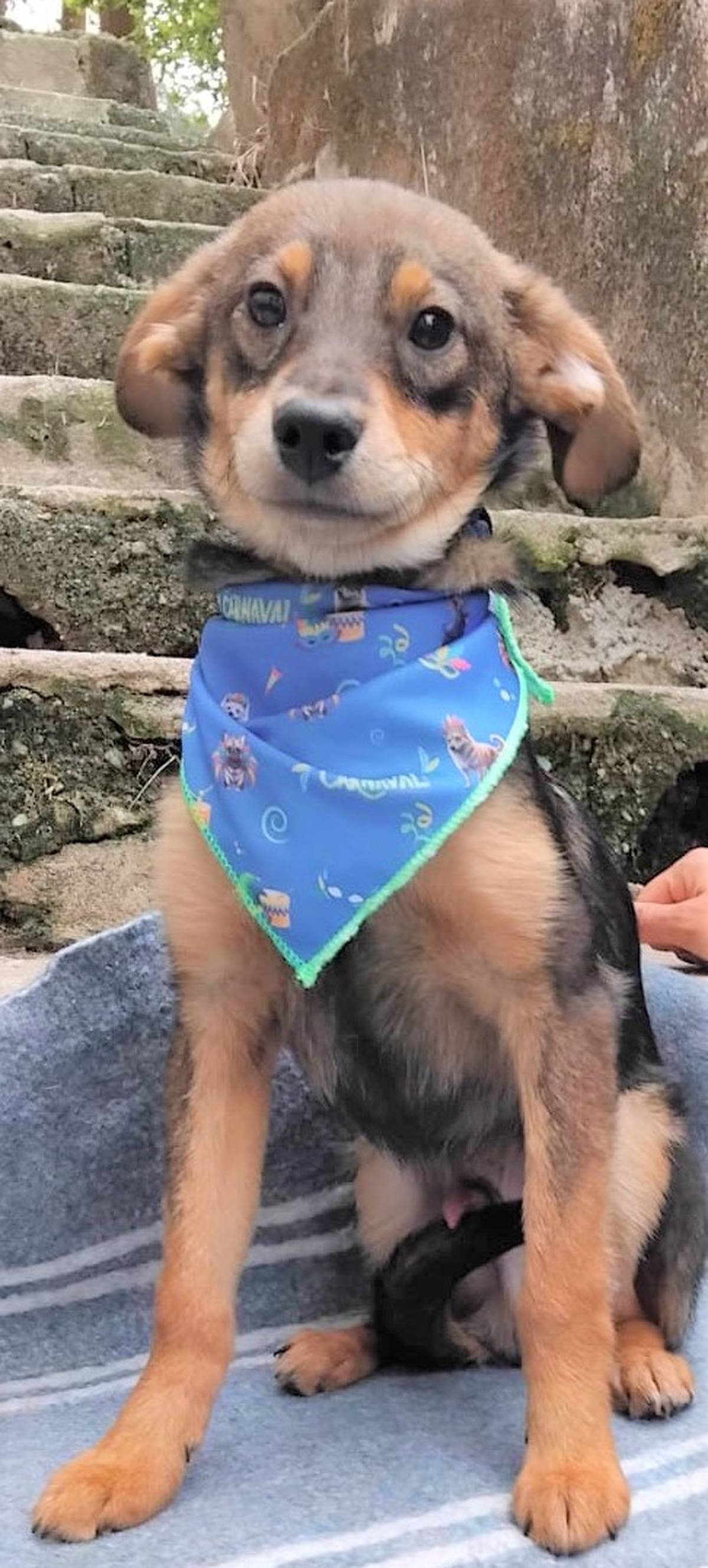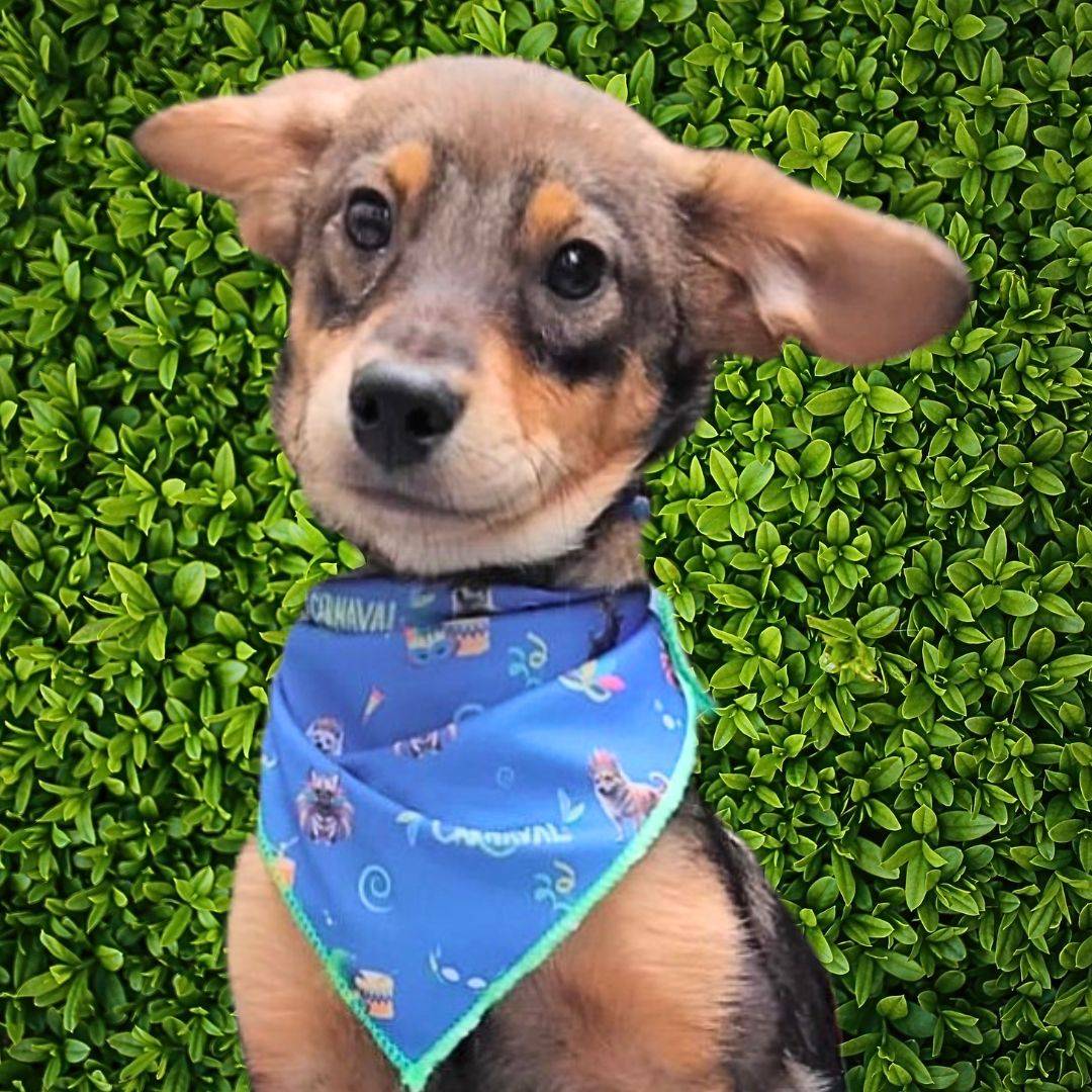 Um filhotinho de 4 a 5 meses, que deve pesar em torno de 8 a 10 kg quando adulto.