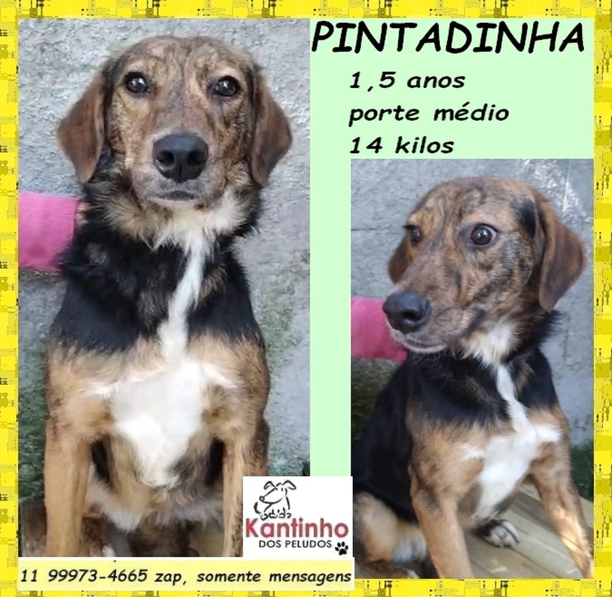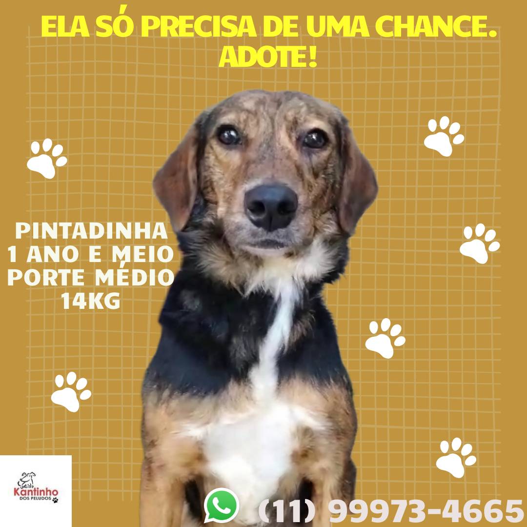 Com apenas 1 ano e meio, ela é uma menina doce, de porte médio, pesando cerca de 14kg. Sua pelagem única, que parece uma pintura, reflete a sua personalidade especial. Pintadinha é dócil, carinhosa e está à espera de um lar onde possa compartilhar todo o amor que tem.