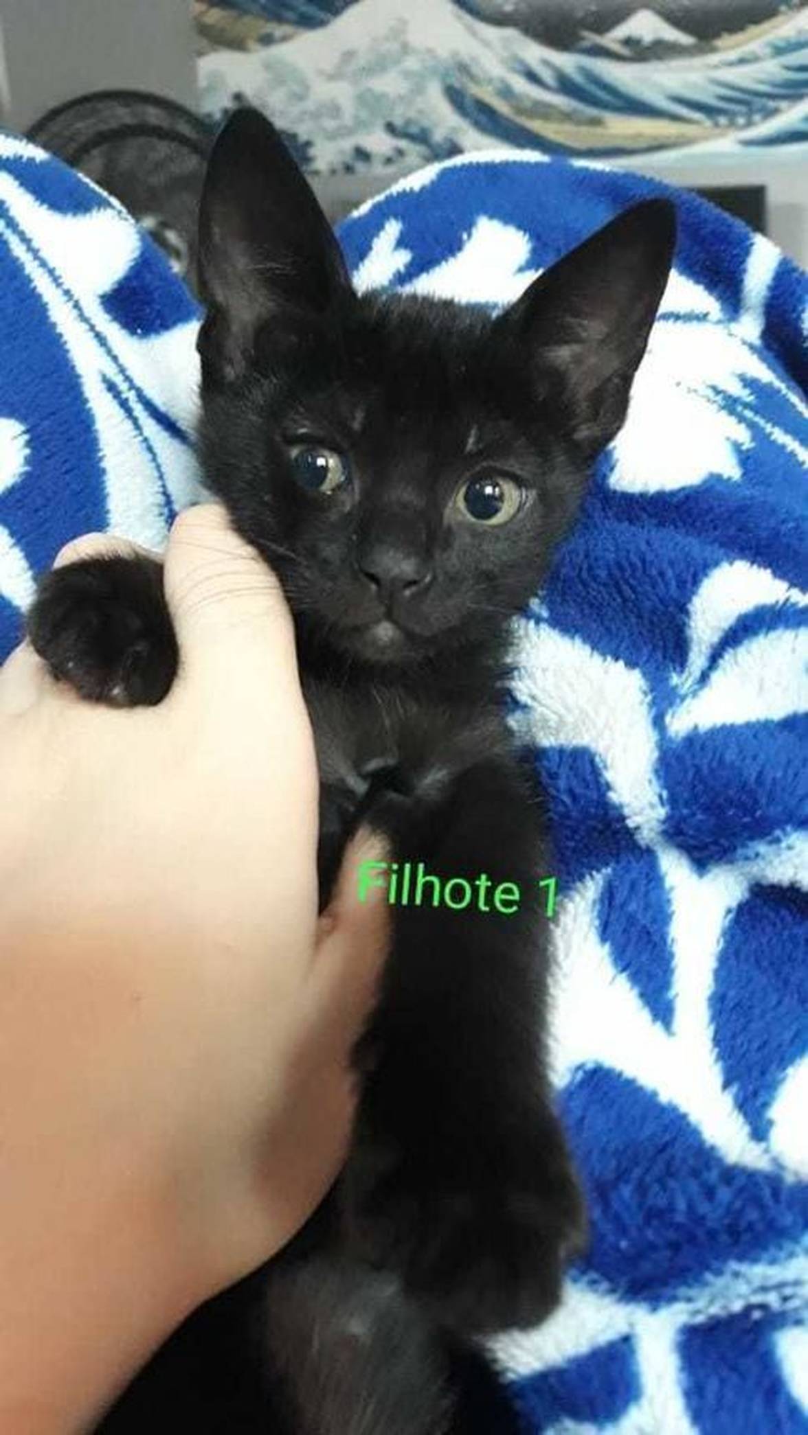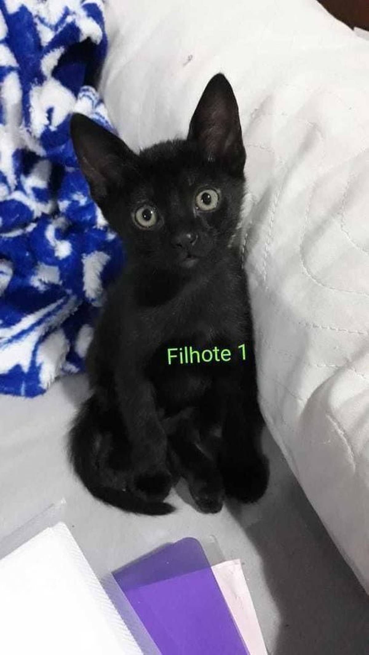 Ele é macho, já come comida seca faz um mês, usa a caixinha de areia sem problemas e está sendo desmamado da mãe agora. Já foi na sua primeira consulta ao veterinário, está saudável, crescendo bem e recebeu sua primeira dose de vermífugo.