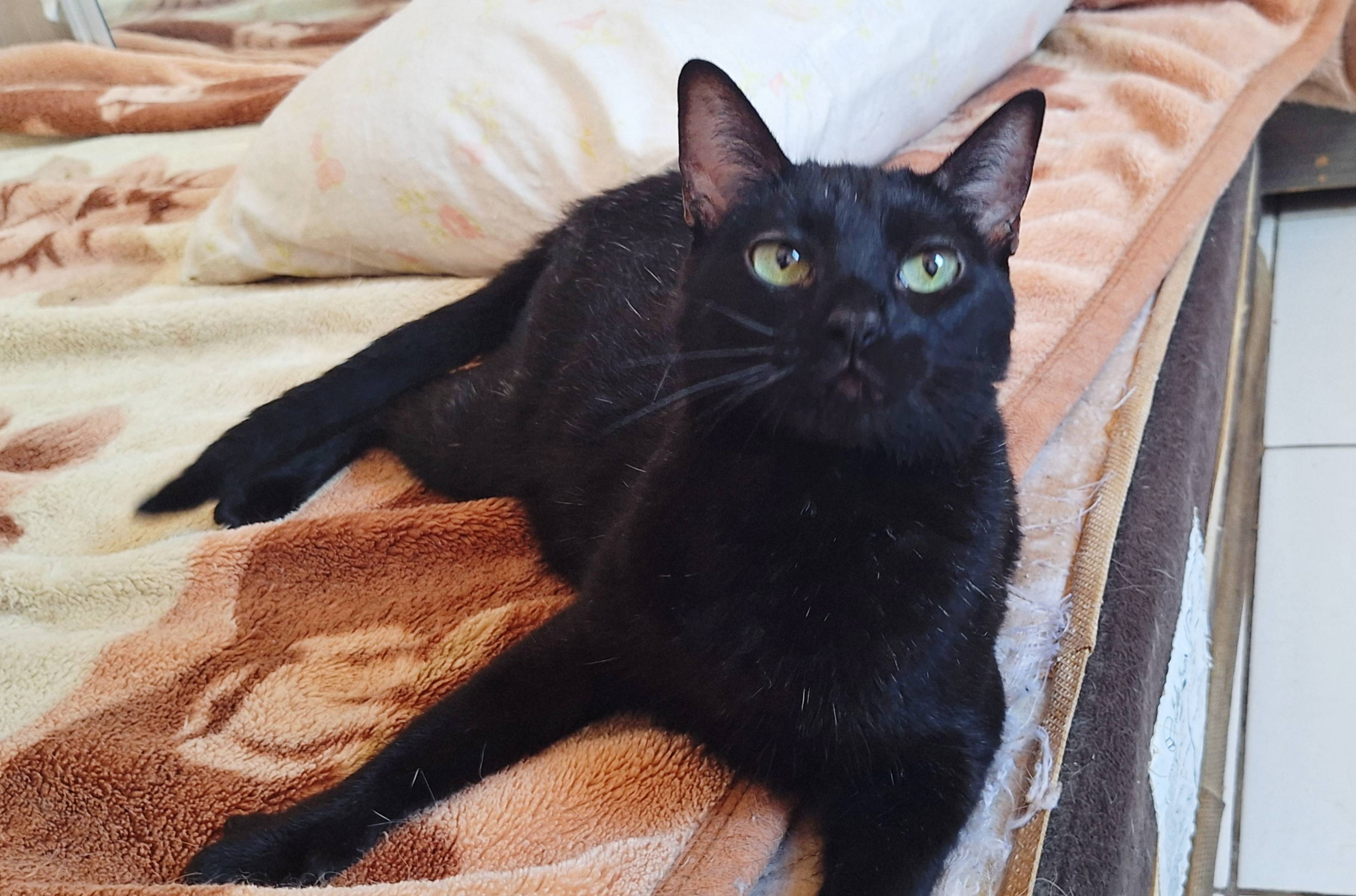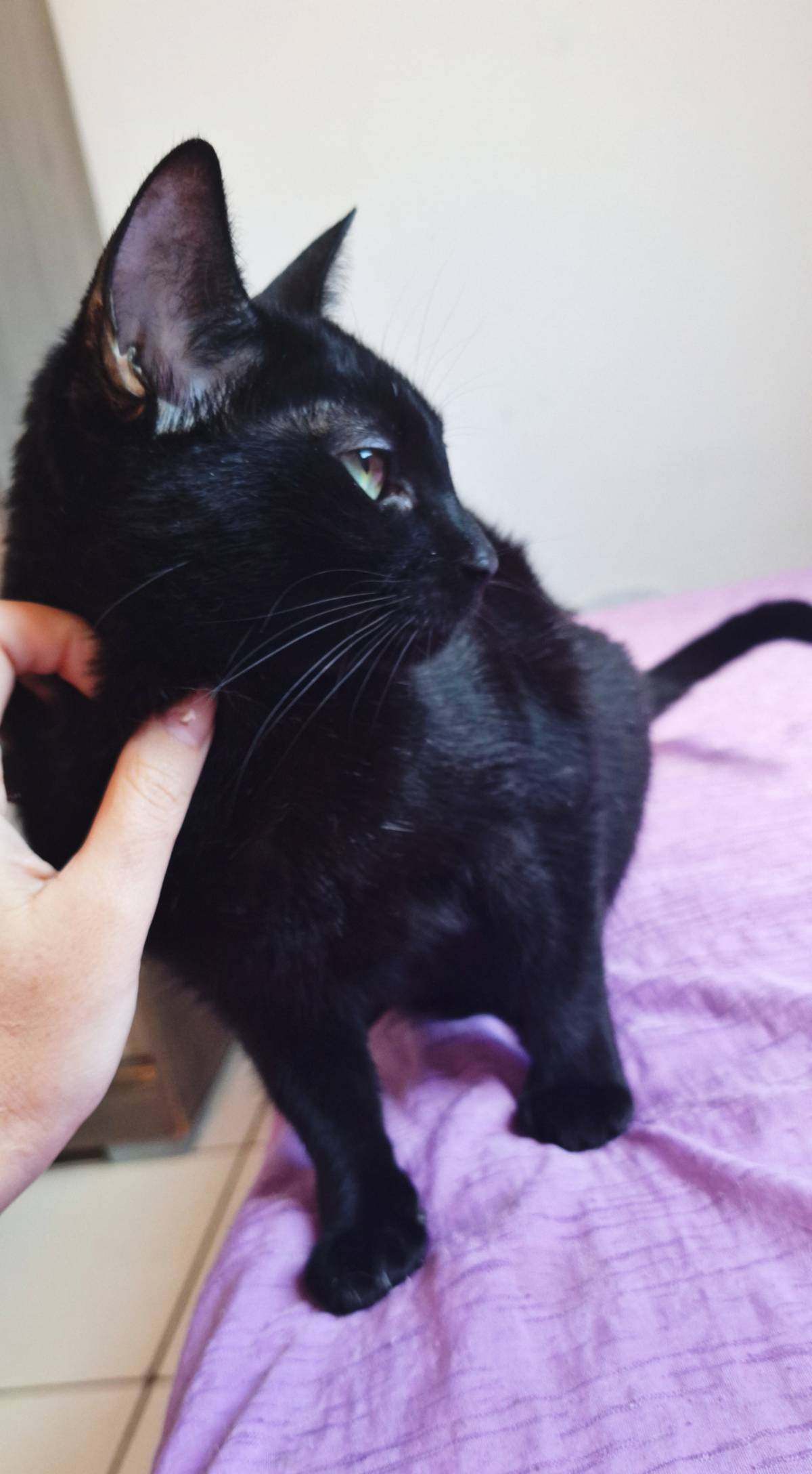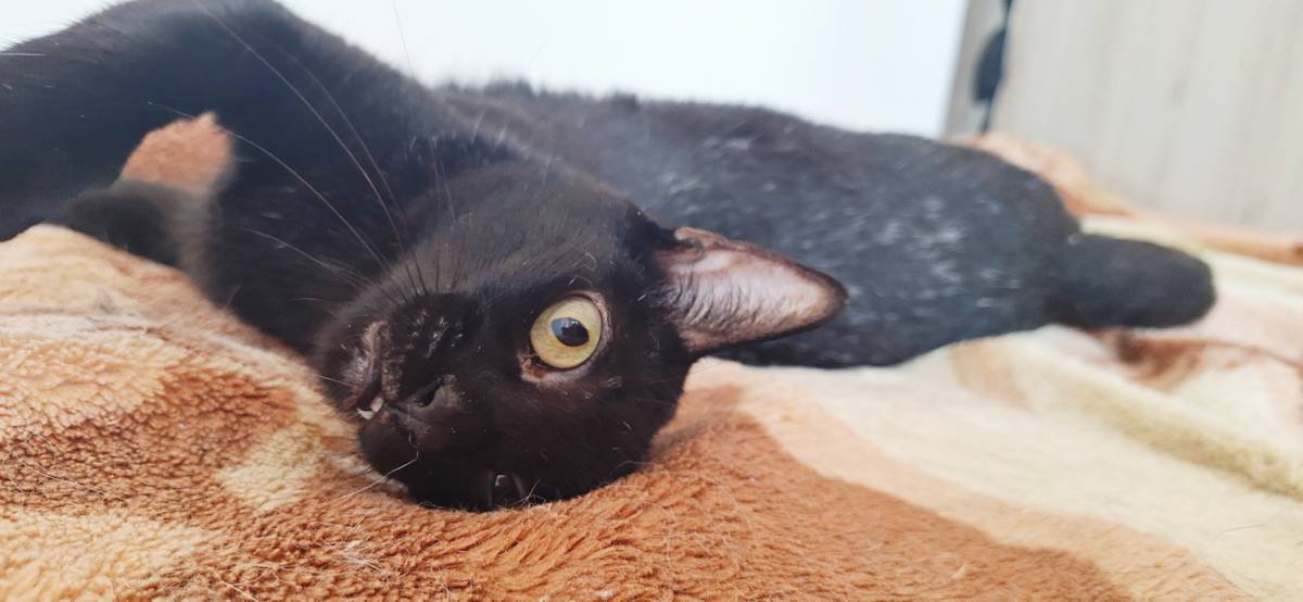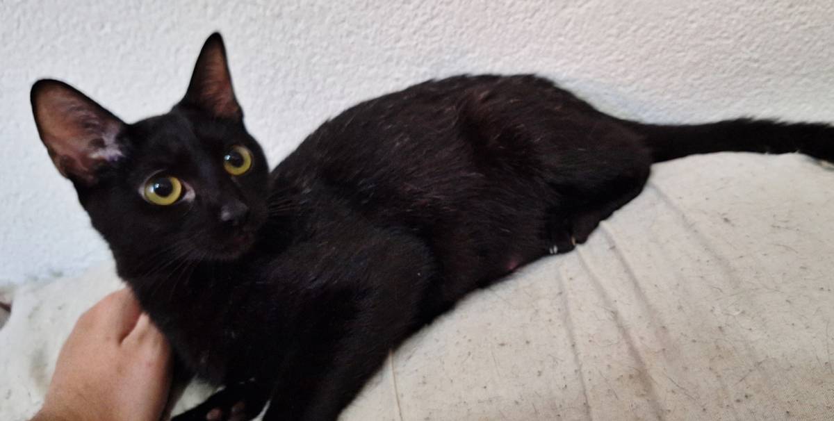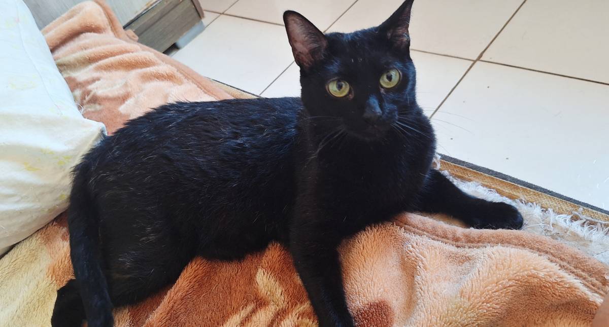 Essa gatinha estava com uma pessoa que perdeu o controle da quantidade de gatos por falta de castração, então ajudamos com as castrações e adoções. Ela estava sendo ameaçada pelo síndico, então acolhemos ela. Isso já faz 1 ano e até hoje por causa da sua cor, ninguém a adorou. Uma gatinha tão incrível!