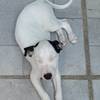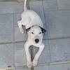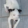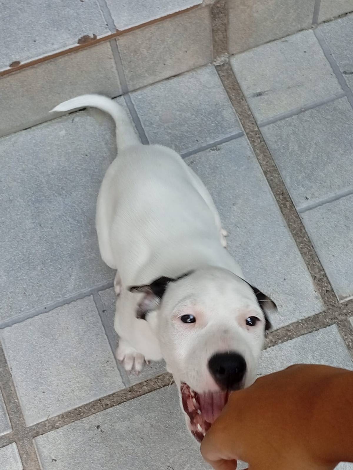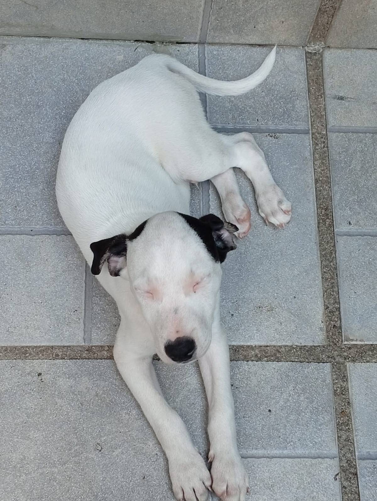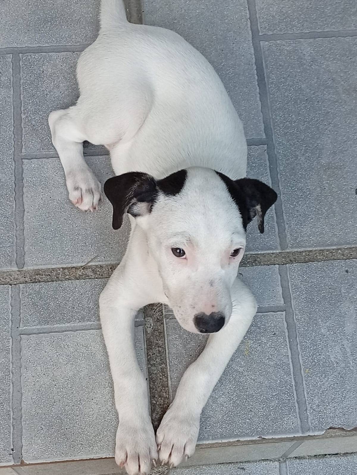 Ele é vira-lata, é todo branquinho das orelhas pretas.
