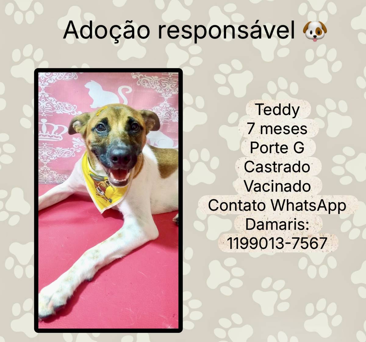 Animais têm sentimentos e precisam de cuidados e atenção todos os dias. Ao adotar, você será responsável por garantir que ele seja cuidado e amado durante toda a vida dele!