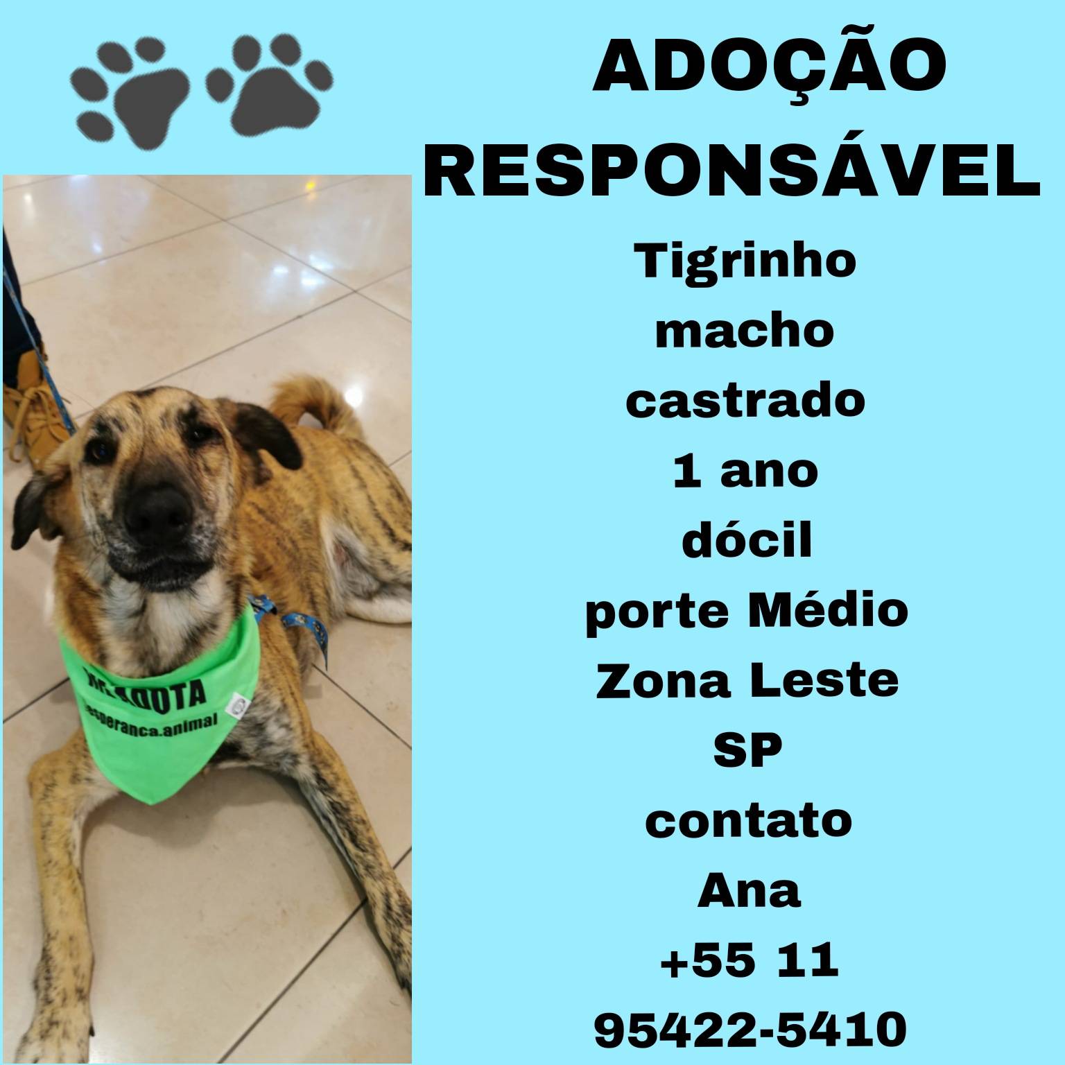 Animais têm sentimentos e precisam de cuidados e atenção todos os dias. Ao adotar, você será responsável por garantir que ele seja cuidado e amado durante toda a vida dele!