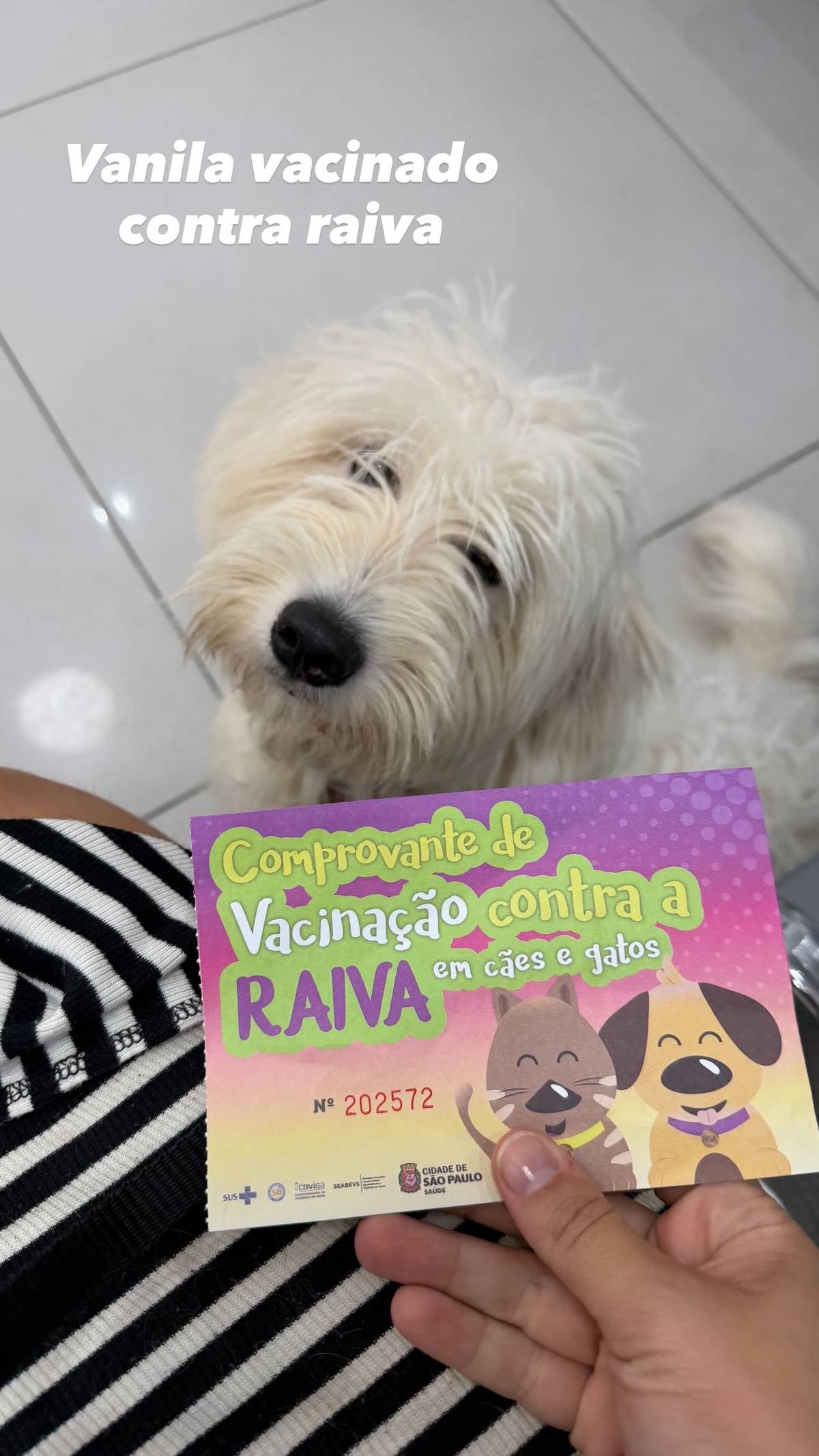 O ciclo vacinal foi iniciado, com a 1º dose da V10 e a vacina da raiva, mas a família adotante precisará finalizar com mais duas doses da V10, obrigatório.