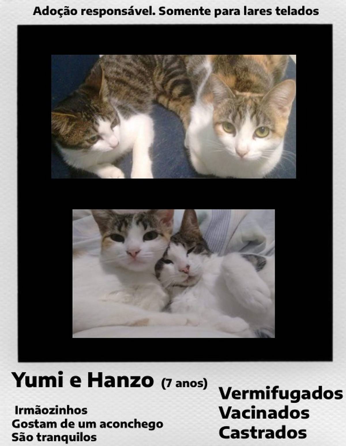 A Yumi e o Hanzo são irmãozinhos tranquilos, que gostam de um bom cafuné e valorizam seu cantinho para descansar. São companheiros doces e discretos, ideais para um lar tranquilo.