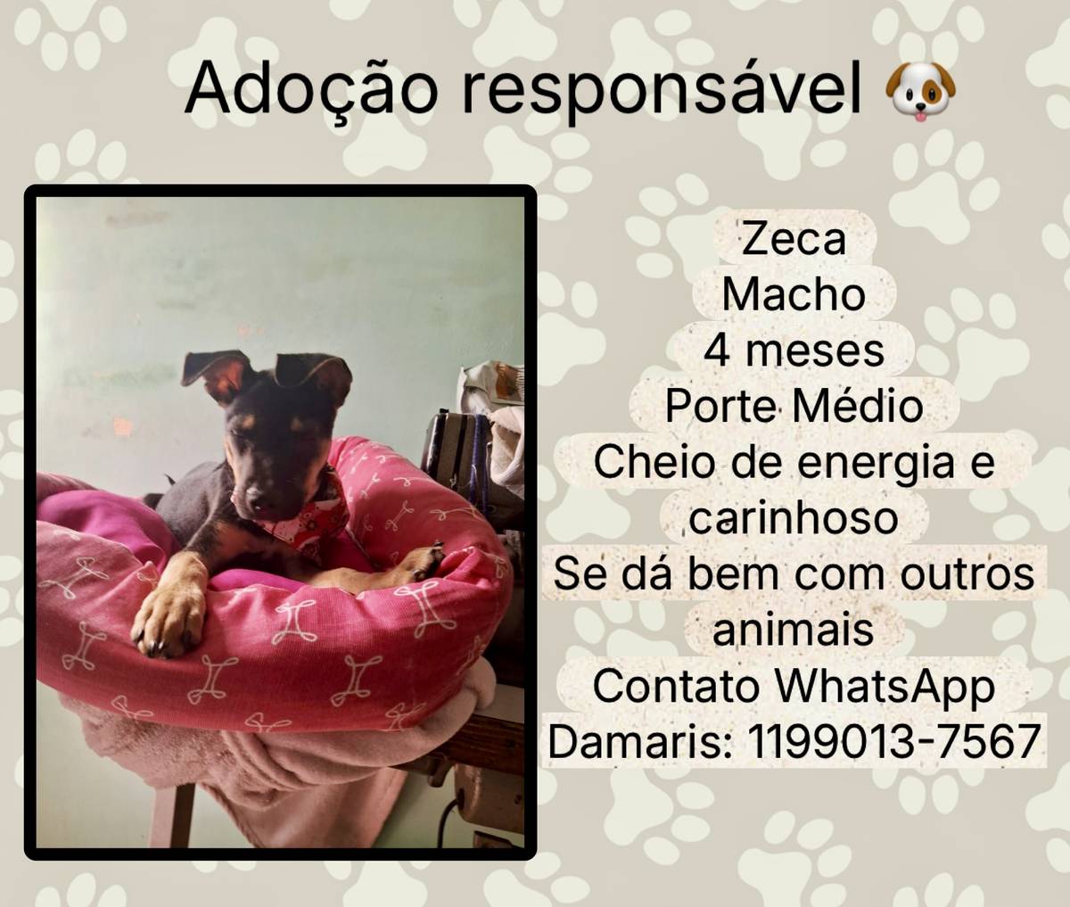 Animais têm sentimentos e precisam de cuidados e atenção todos os dias. Ao adotar, você será responsável por garantir que ele seja cuidado e amado durante toda a vida dele!
